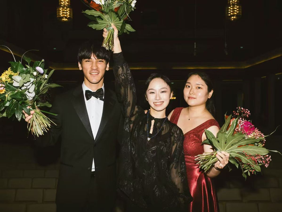 Winners of the piano category of the 74th edition of the ARD International Music Competition pose together: second prize winner, Elias Ackerley (left), first prize winner Wang Liya (middle) and third prize winner Jiwon Yang. [Photo provided to chinadaily.com.cn]
