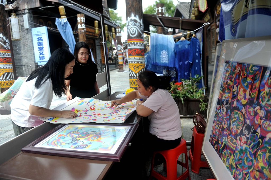 Visitors appreciate cultural products at Danzhai Wanda Town, Guizhou province. [Photo/IC]