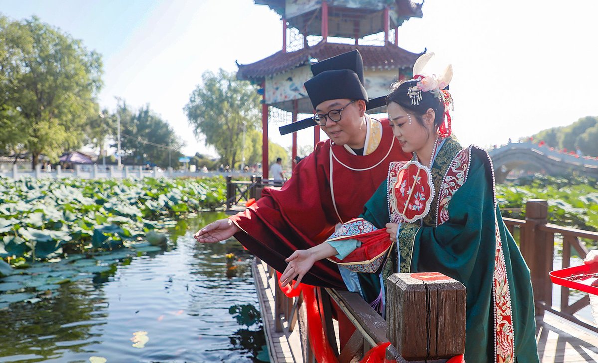 Fifteen couples recently held a traditional group wedding at Lianxin Lake in Liaozhong district, Shenyang, Liaoning province. [Photo provided to chinadaily.com.cn]