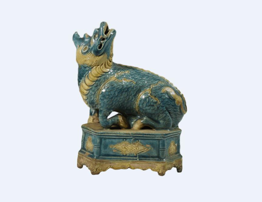 This Ming Dynasty (1368-1644) ceramic brings to life a majestic qilin — a benevolent beast from Chinese legend endowed with exceptional virtues. Crouching on a hexagonal pedestal, this unicorn-like creature raises its head and turns it backward, with its mouth slightly open. It has fins on its back, and its entire body is covered in scales. Its tail is curled upwards and attached to its back. The peacock green and yellow glazes are characteristic of Fahua ware.
