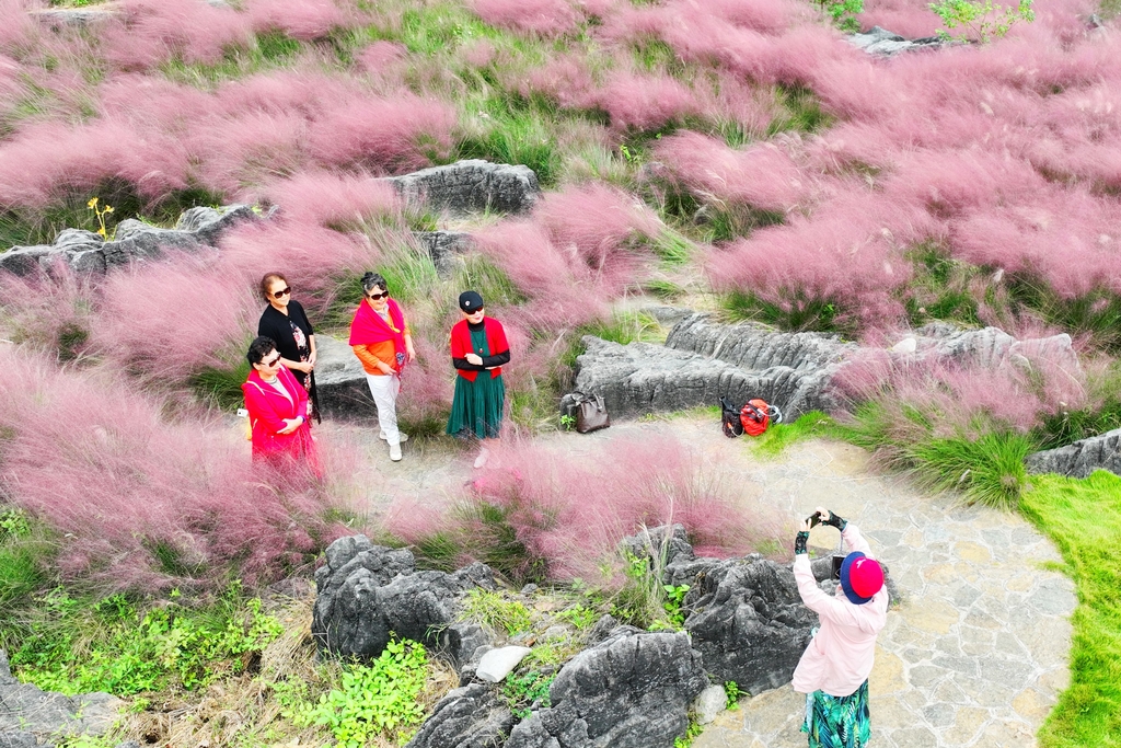 In Chongqing’s Youyang Tujia and Miao autonomous county, crowds of visitors flock to Dieshi Flower Valley scenic area. Vast stretches of the fluffy pink blooms have now entered their peak viewing season, blanketing the scenic area with a romantic sea of color.