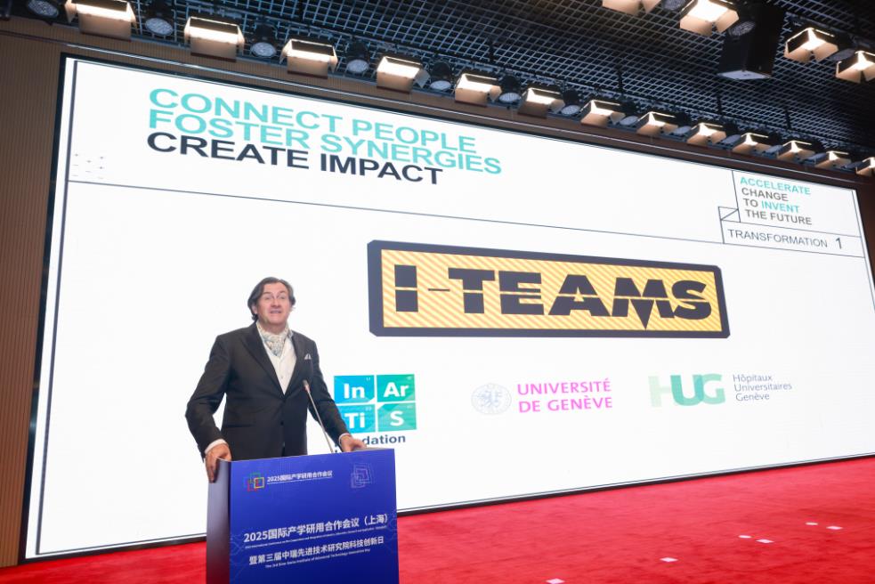 Benoît Dubuis, director of the Sino-Swiss Institute of Advanced Technology, introduces the iTeams program at the 2025 International Conference on the Cooperation and Integration of Industry, Education Research and Application (Shanghai) on Sept 23. [Photo provided to chinadaily.com.cn]