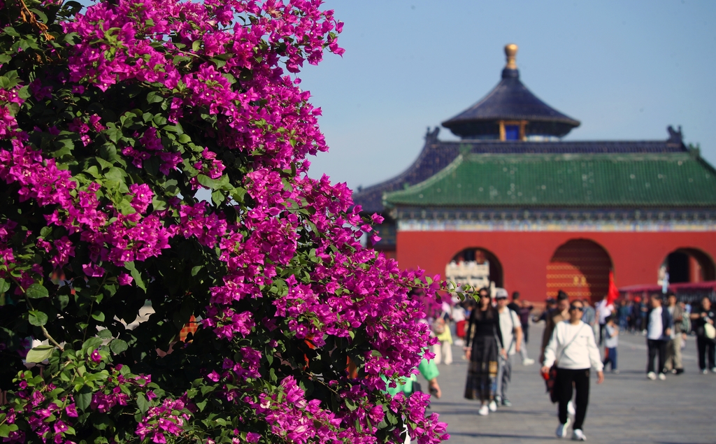 In the golden autumn season, Beijing’s Temple of Heaven is adorned with vibrant blossoms, attracting large numbers of visitors.