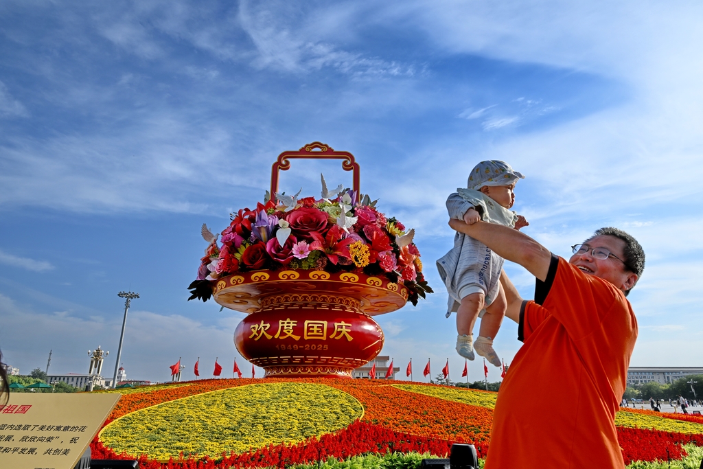 As National Day on Oct 1 approaches, the National Day “Blessing the Motherland” giant flower basket has drawn crowds of visitors to Beijing’s Tian’anmen Square. The festive basket serves as the centerpiece, filled with flowers symbolizing good wishes, along with olive branches and doves of peace. It embodies the theme of “peaceful development and prosperity”, expressing blessings for a flourishing nation, peace and well-being for the people, hopes for global peace and development, and the creation of a better future together.