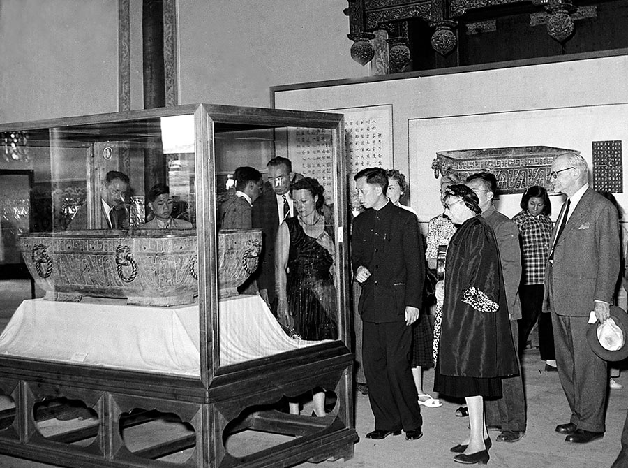 A group of French guests view bronzeware on display in the Palace Museum in the 1950s. [Photo provided to China Daily]