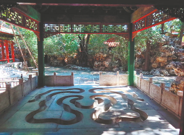 Artisans carved out stone-slab flooring to mimic streams where the ancient literati played a drinking game of floating cups along a serpentine stream, enjoying wine and composing poetry.