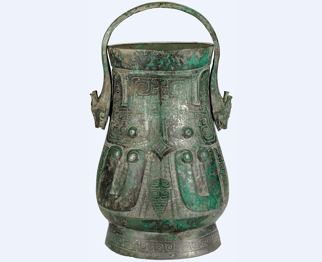 This bronze wine vessel from the Shang Dynasty (c. 16th century-11th century BC) features a handle in the shape of dragon heads, adorned with square-grid patterns. The decoration on the body presents an inverted beast mask composed of spiral motifs, eye motifs, kui dragon (one-legged dragon) motifs and cicada motifs. Its foot ring is embellished with a band of square-spiral motifs.