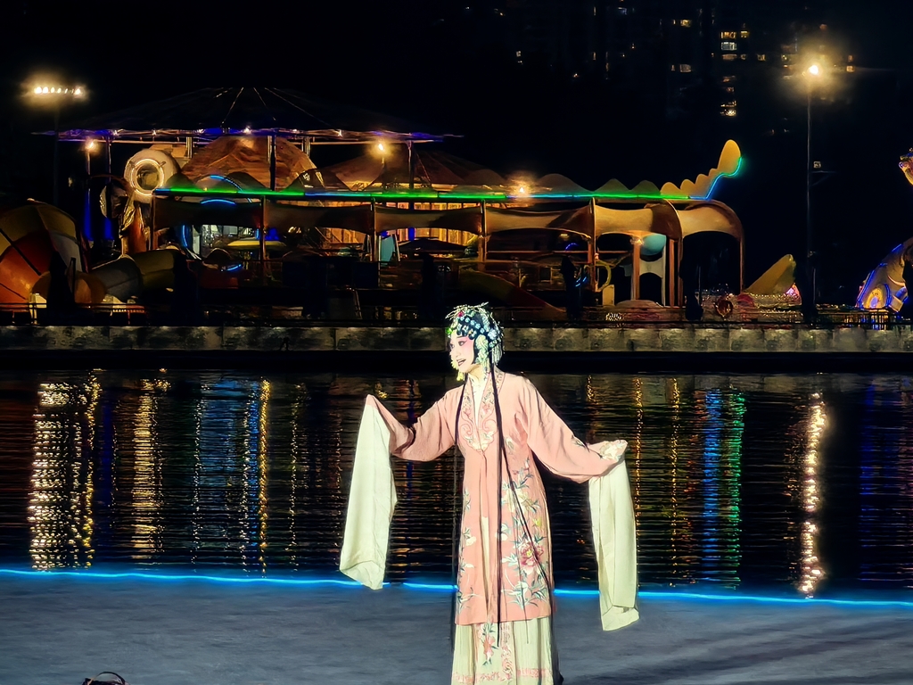 With light as the curtain and the river as the prelude, colorful beams followed the winding Liangma River into Chaoyang Park, where Beijing’s first floating water-light stage presented a stunning cross-water aerial performance — blending rippling water, art, light and music into a dreamlike scene.