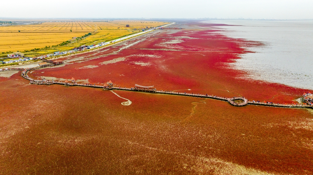 The Red Beach National Scenic Corridor in Panjin, Liaoning province, has entered its peak viewing season. Vast stretches of wild seepweed have turned a deep crimson, creating a breathtaking “red carpet” landscape that draws crowds of visitors for sightseeing and photography.