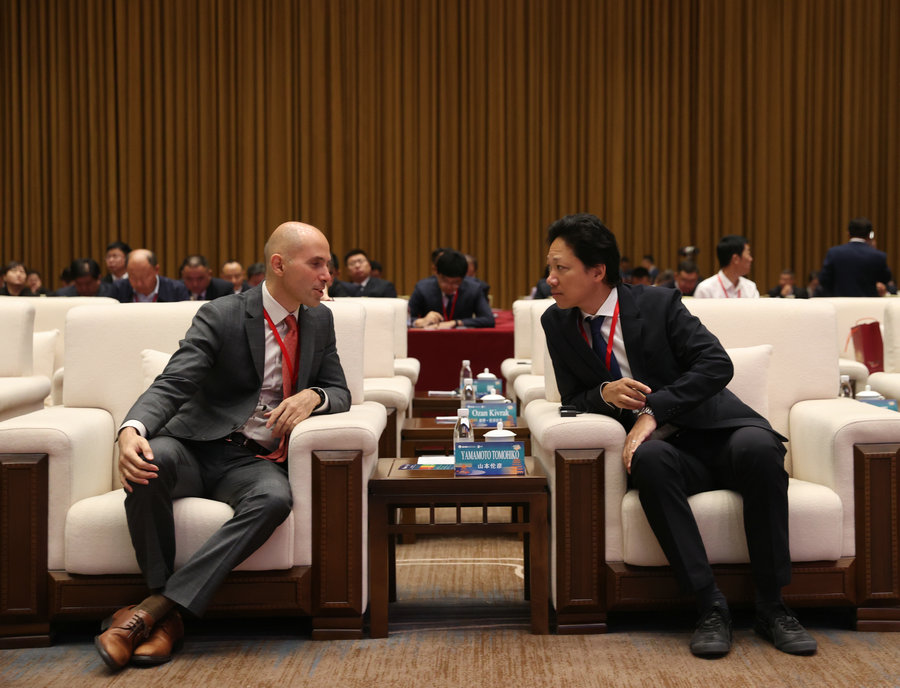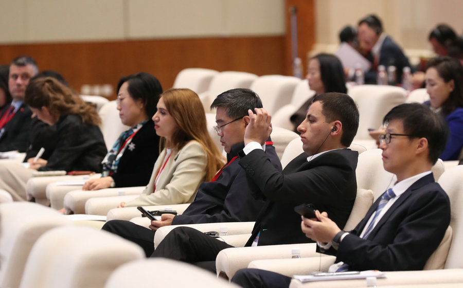 Guests interact before the commencement of the opening ceremony for the "Global Mayors Dialogue · Dunhuang" in Dunhuang, Gansu province, Oct 13, 2025. [Photo by Chen Zebing/chinadaily.com.cn]