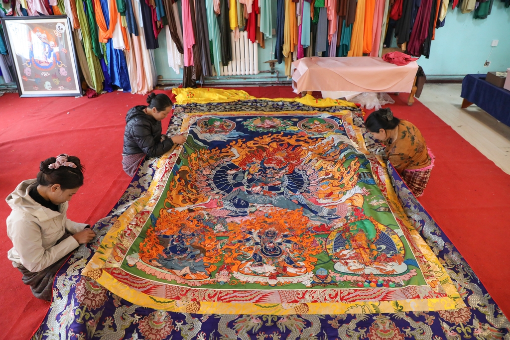 Artisans make a Horsehair Thread Thangka work. [Photo/IC]