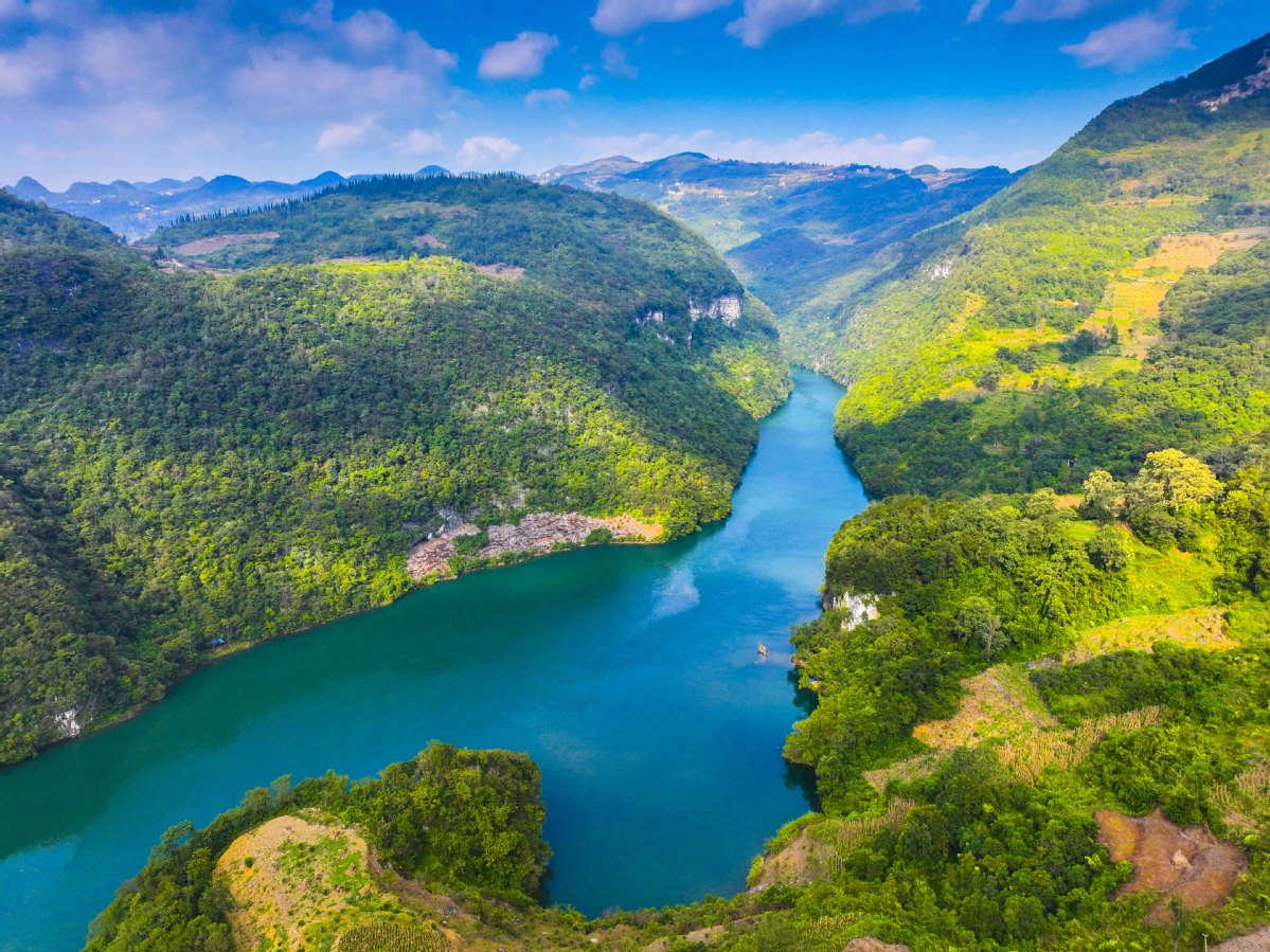 Aerial photos reveal the dramatic karst landscape of Guizhou province, where deep gorges and winding rivers carve the scenery.