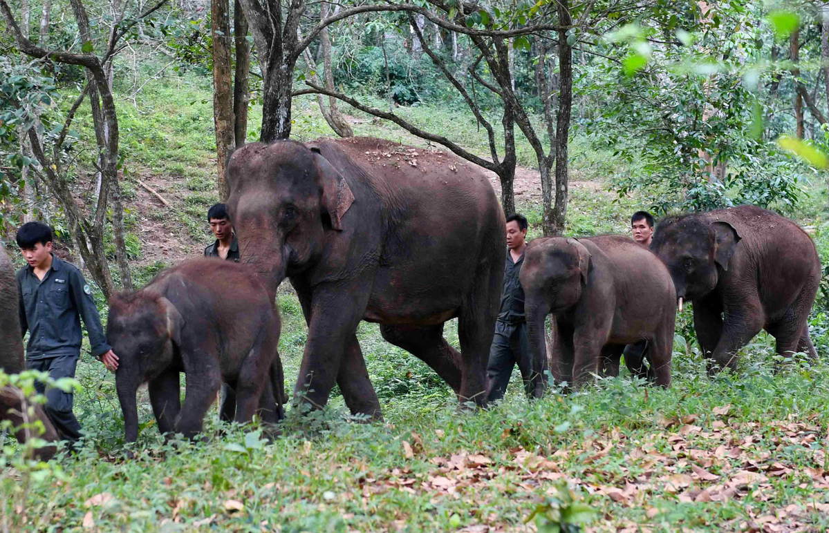 Professional workers guide Asian elephants in a rewilding training session at a major rescue and breeding center in Xishuangbanna, Yunnan province. [Photo/Xinhua]