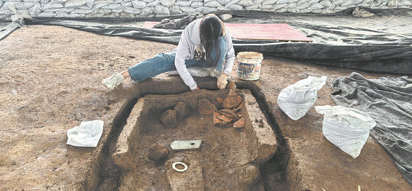 An archaeologist working on the Doushan site. Since July 2024, a joint archaeological team with members from provincial and national institutions has carried out a large-scale excavation. [Photo provided to China Daily]