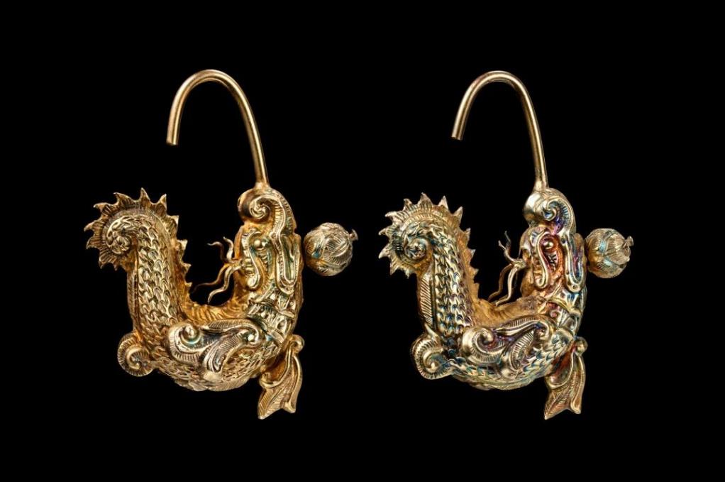 Gold earrings in the design of Makara with buds, Liao Dynasty (916-1125) [Photo/Capital Museum official WeChat account]