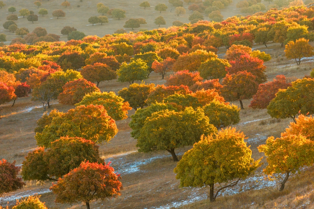 In Horqin Right Wing Middle Banner, Hinggan League, Inner Mongolia autonomous region, there are vibrant five-lobed maple trees in autumn hues. [Photos/IC]