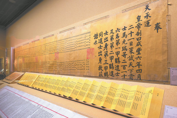 Two golden lists announcing the names of candidates who cleared the final stage of the Qing imperial examination system on display. [Photo by WANG RU/CHINA DAILY]