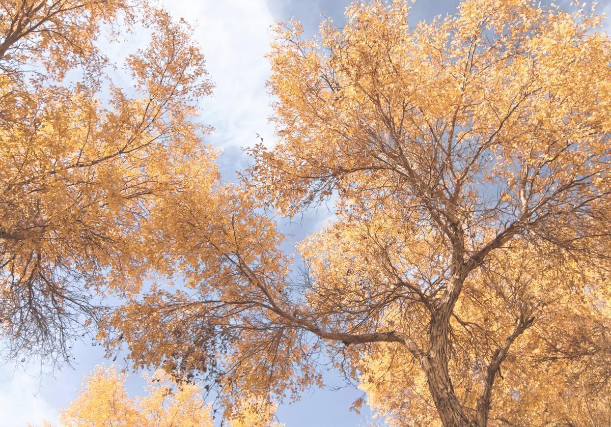 Along the banks of the Tarim River, thousands of desert poplar trees stand sentinel, their robust and twisted trunks resembling calligraphy strokes. Basking in the sunlight, their hues swirl with the caress of the wind, orchestrating an autumnal symphony.