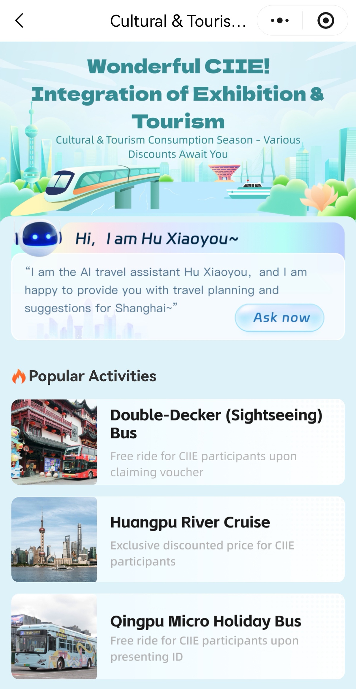 From Nov 5–10, exhibitors and visitors can enjoy free rides on 11 double-decker sightseeing bus routes covering more than 60 major downtown attractions. Advanced booking is required through the Suishenxing platform, and passengers should present their reservation with a valid CIIE badge when boarding.