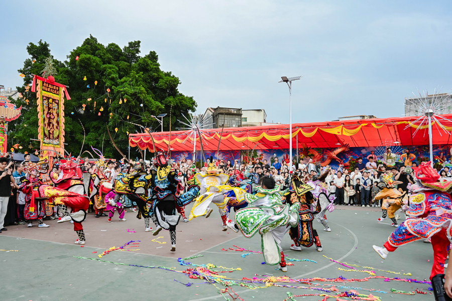 Local youths perform Yingge, a folk dance unique to the Chaoshan area on the Chongyang Festival in Chendian, Chaonan district of Shantou, South China’s Guangdong province, on Oct 29, 2025. [Photo by Yang Xiaoyu/chinadaily.com.cn]