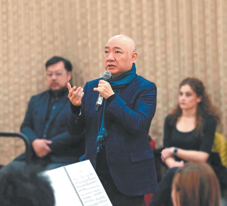 Xu Zhong (center), artistic director of Shanghai Opera House, at the rehearsal of the company's new production of Cosi fan tutte. The semi-staged production will be performed at Shangyin Opera House on Sunday. CAO JIAMIAO/FOR CHINA DAILY