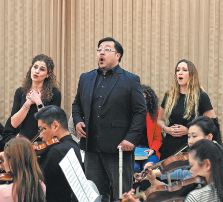 Italian mezzo-soprano Serena Malfi (left), Chinese bass singer Yu Yang (center), and French soprano Chloe Chaume (right) perform a trio at the rehearsal of the new production. CAO JIAMIAO/FOR CHINA DAILY