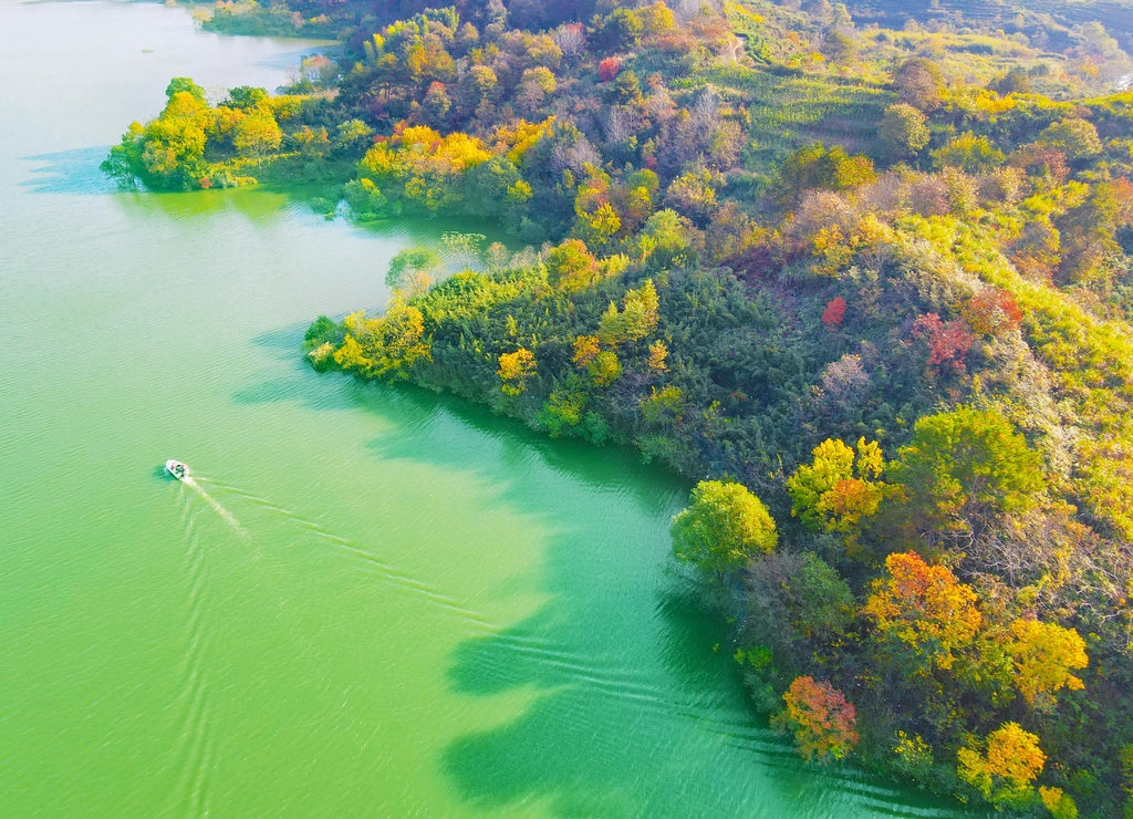 In Yuexi county, Anqing, Anhui province, the scenery around Tiantang Lake is enchanting. The lake’s emerald-green waters are as clear as a mirror, while the trees along the shore display layers of vibrant colors — red, orange, yellow and green intertwining. Boats gliding across the lake complete a naturally beautiful picture.