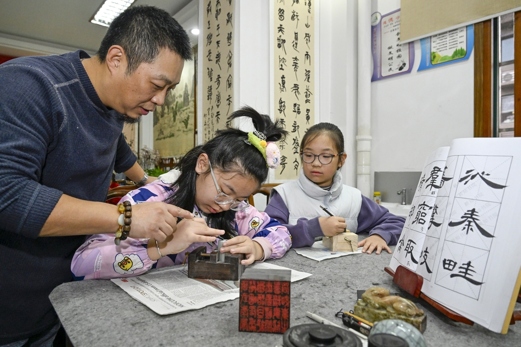 Students are creating their own seal carving works under the guidance of an instructor. [Photo/IC]