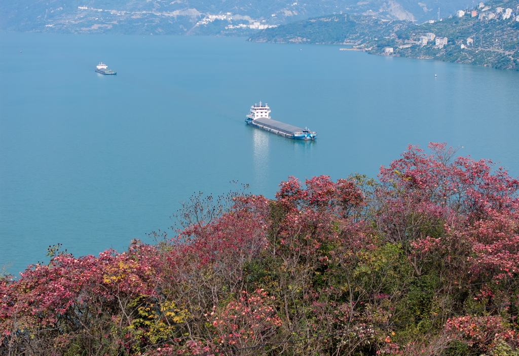 The fiery red leaves blanket both banks of the Yangtze River in Zigui county, Yichang, Hubei province. Reflected against the emerald waters of the river, the scenery becomes a breathtaking sight.