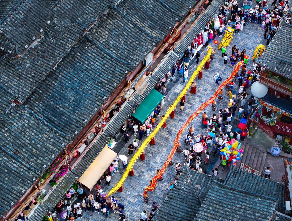 Visitors to Shiban Street, a stone-slab lane in Duyun, Guizhou province, walk between rows of stilted wooden houses on paving that dates back to the early Ming Dynasty (1368–1644).