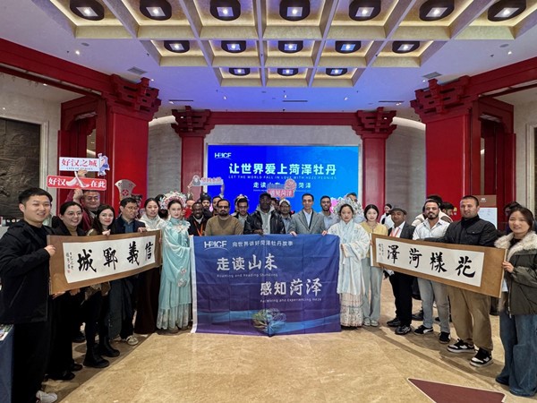 Foreign visitors from 15 partner countries participating in the Belt and Road Initiative pose for a group photo during their trip in Yuncheng, Shandong province, on Nov 13. [Photo provided to chinadaily.com.cn]