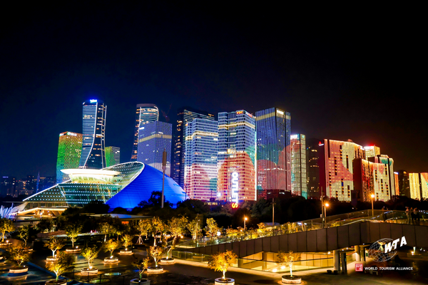 A light show is featured in the event of The Night of Hangzhou, part of the Xianghu Dialogue 2025 hosted by the World Tourism Alliance on Nov 19, 2025 in Hangzhou, capital of East China's Zhejiang province. [Photo provided to chinadaily.com.cn]