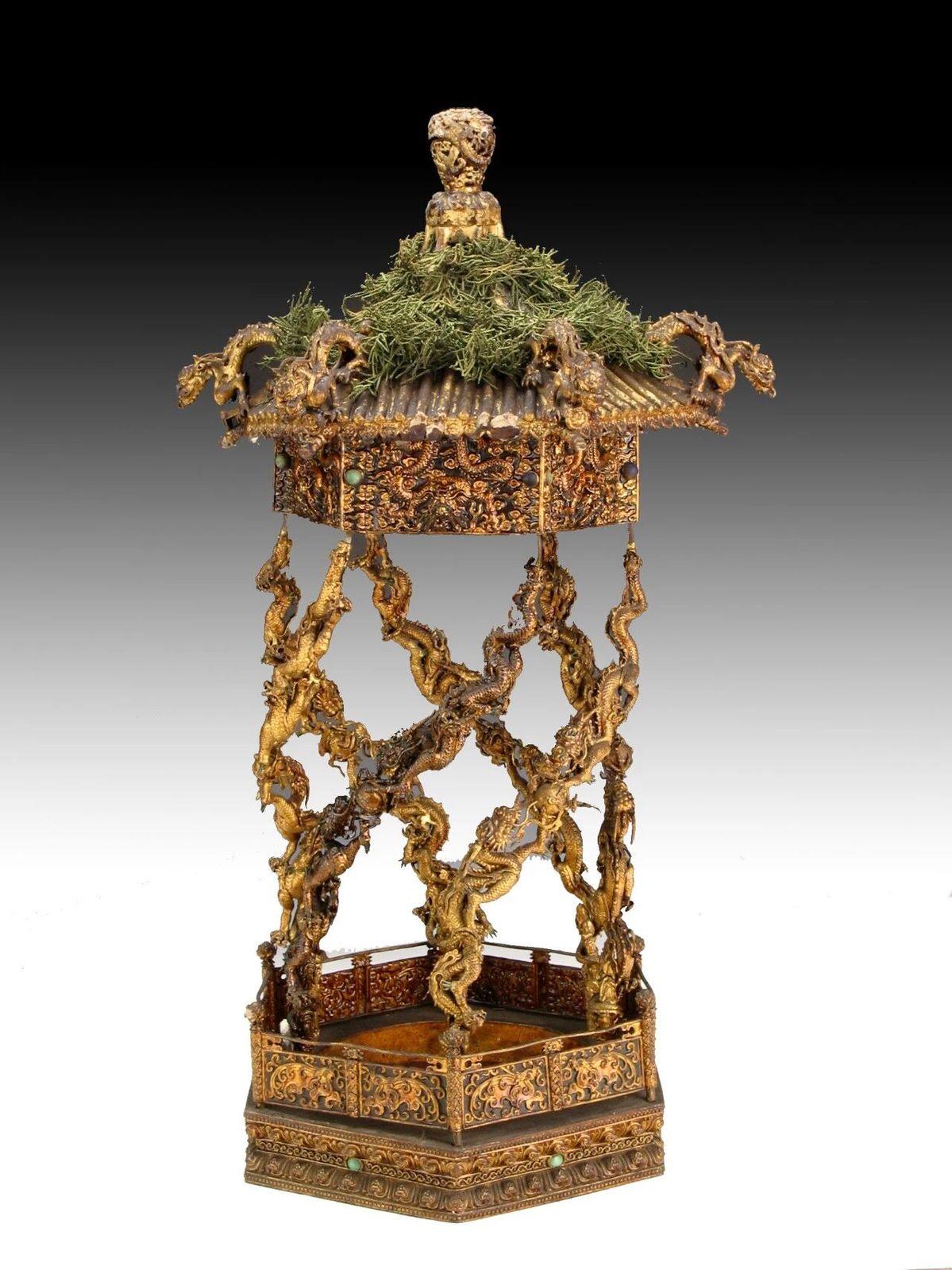 Gilded bronze fruit container with a canopy decorated with pine needle, from the collection of the Shenyang Palace Museum [Photo/Shenyang Palace Museum official WeChat account]