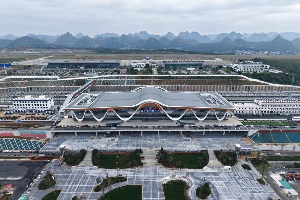 A drone photo shows the Xingyi South Railway Station in Guizhou province on Nov 12, 2025. [Photo/Xinhua]