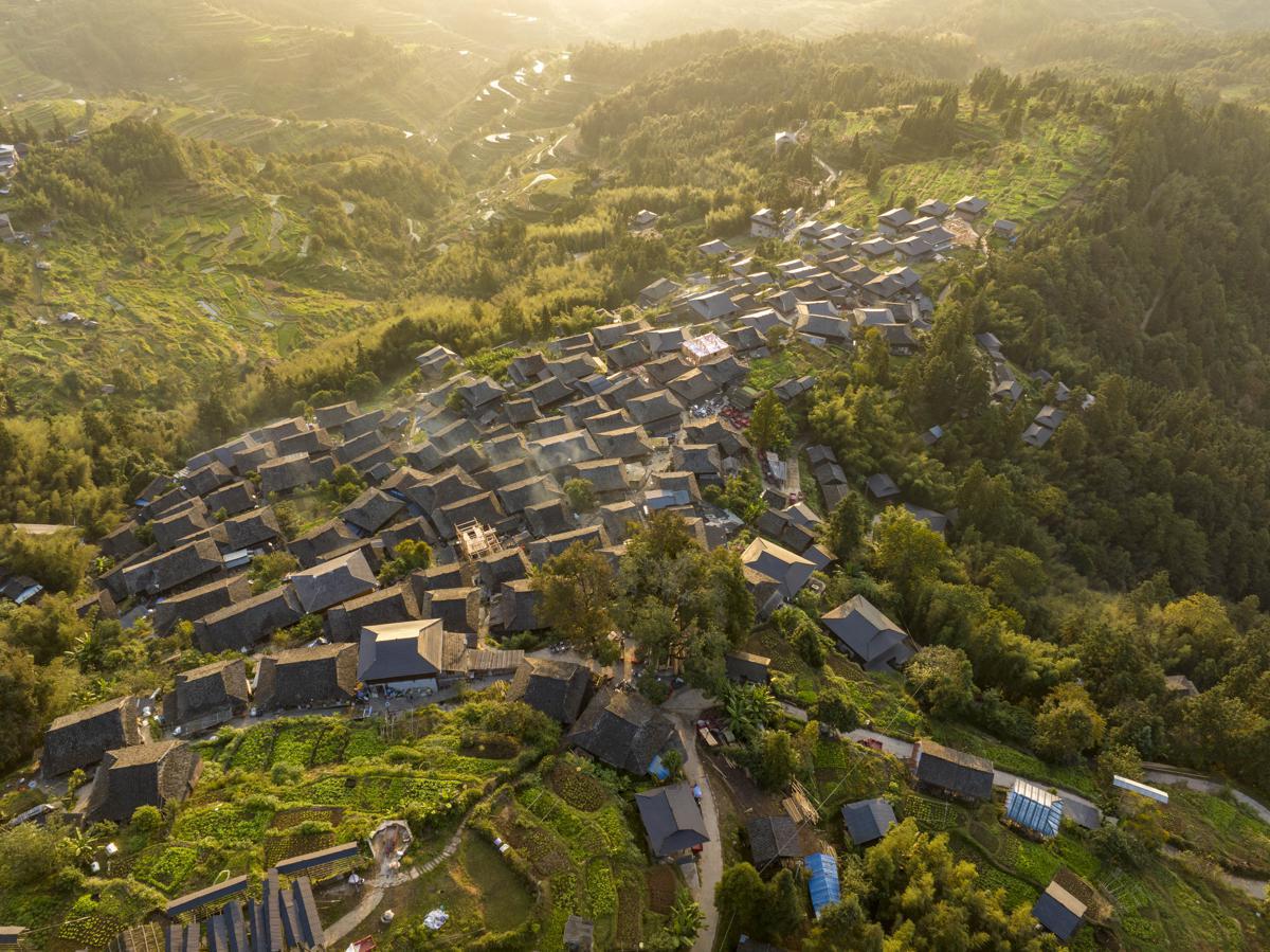 Aerial photos show Basha Miao village in Congjiang county, Guizhou province, bathed in the warm glow of early-winter sunlight. The village's roads, ridgelines and stilt houses gleam brightly along the mountainside.