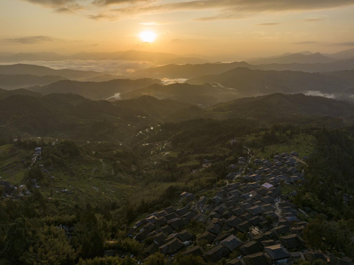 An aerial photo captures Basha Miao village in Congjiang county, Guizhou province, bathed in the warm glow of early-winter sunlight. [Photo by Wu Dejun/For chinadaily.com.cn]