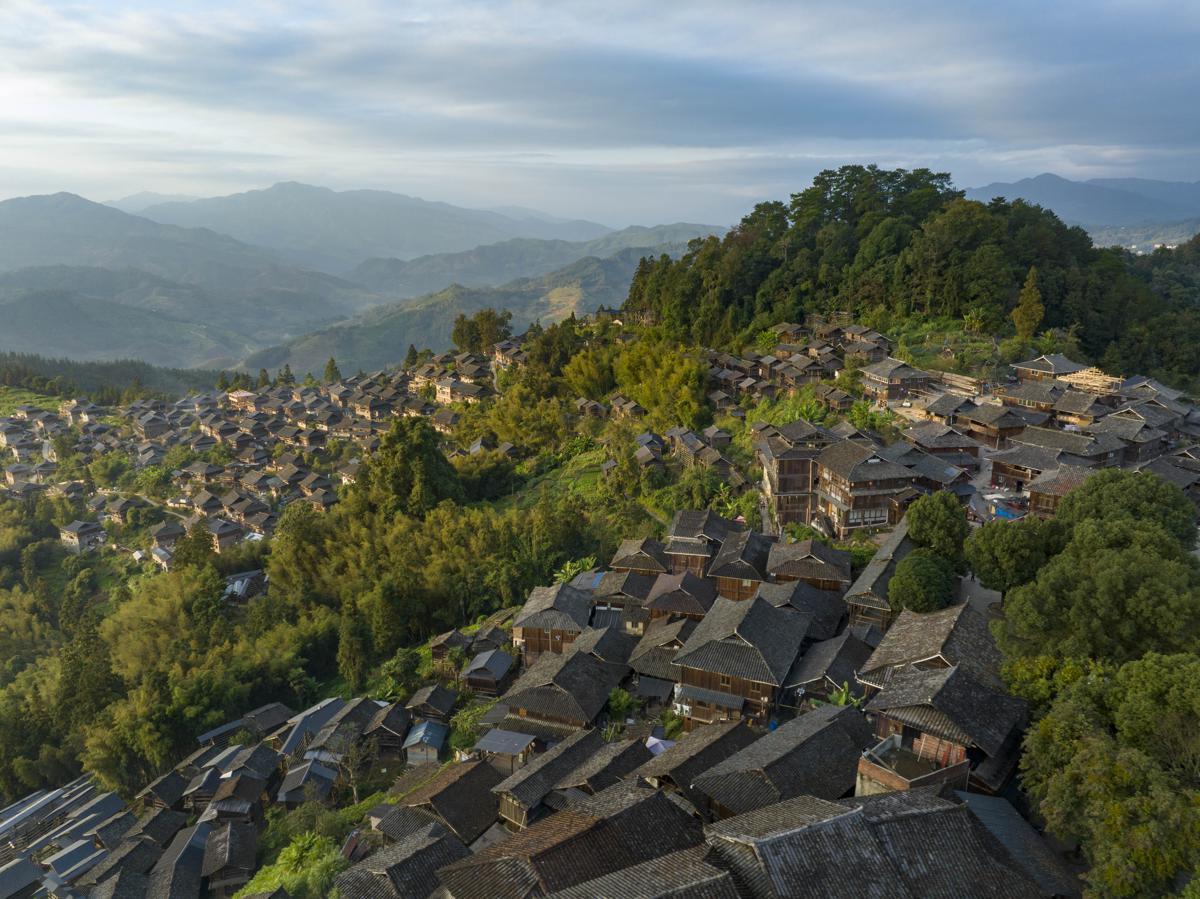 An aerial photo captures Basha Miao village in Congjiang county, Guizhou province, bathed in the warm glow of early-winter sunlight. [Photo by Wu Dejun/For chinadaily.com.cn]