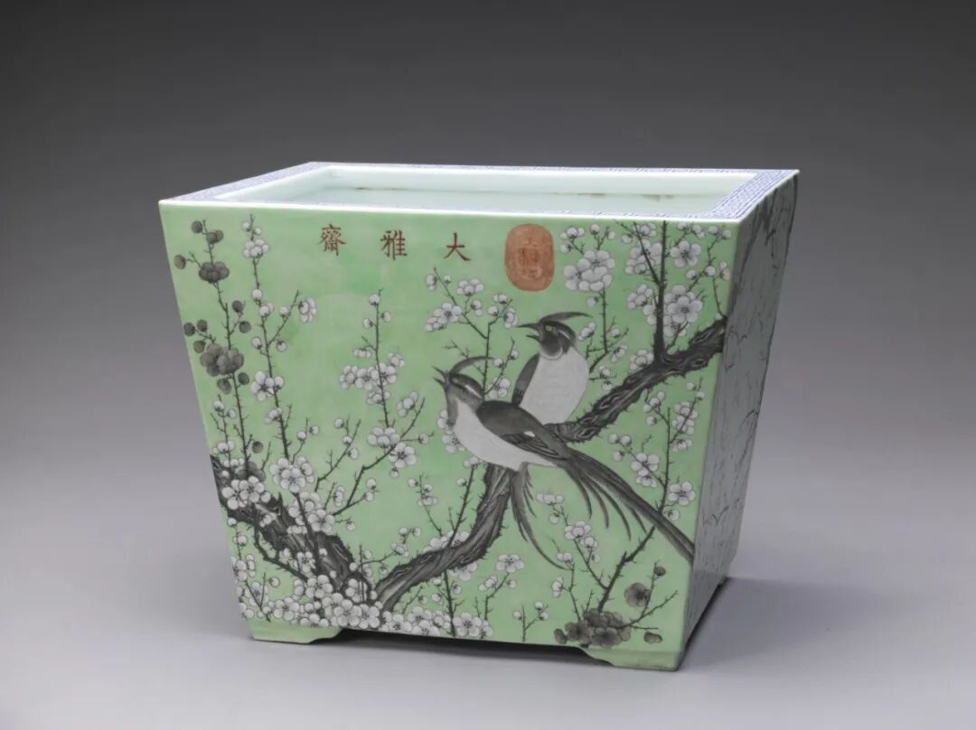 Green-glazed square flowerpot with black bird and flower motifs, inscribed "Daya Zhai" (Studio of Great Elegance), Qing Dynasty, from the collection of the Palace Museum [Photo/Chongqing China Three Gorges Museum official WeChat account]