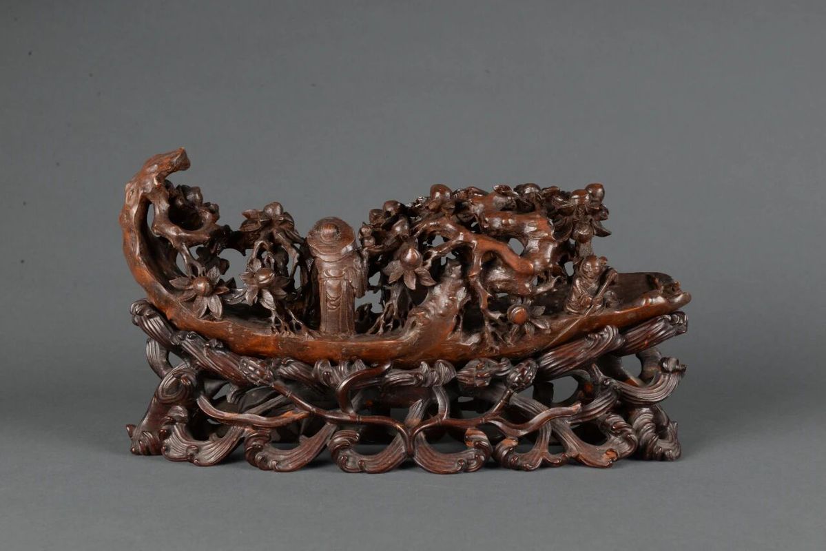Openwork rosewood pedestal with design of figures under peach trees, Qing Dynasty (1644-1911), from the collection of the Nanjing Museum [Photo/Wuxi Museum official WeChat account]