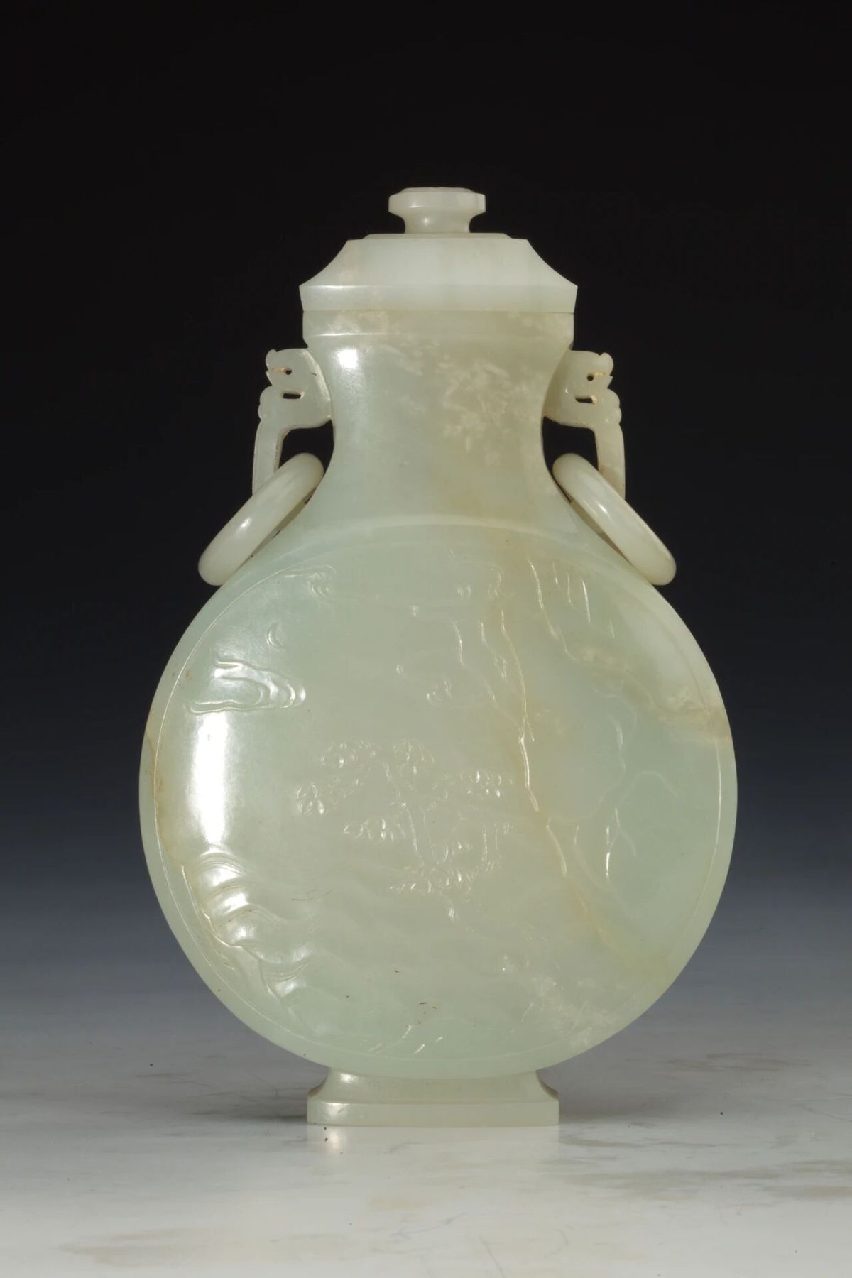 Jade vase with two ring-shaped handles and motifs of landscapes and figures, Qing Dynasty, from the collection of the Wuxi Museum [Photo/Wuxi Museum official WeChat account]