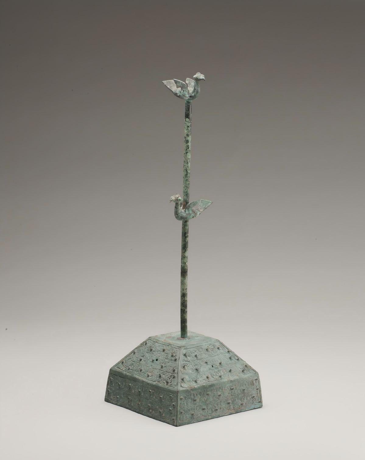 Try to guess the purpose of this bronze artifact. Its square base rises into a central pole, which is adorned with two birds, one on the top and one in the middle — each facing a different direction at a right angle to each other. The birds' eyes are beautifully inlaid with turquoise. The base is decorated with rows of rivets and square-spiral motifs.