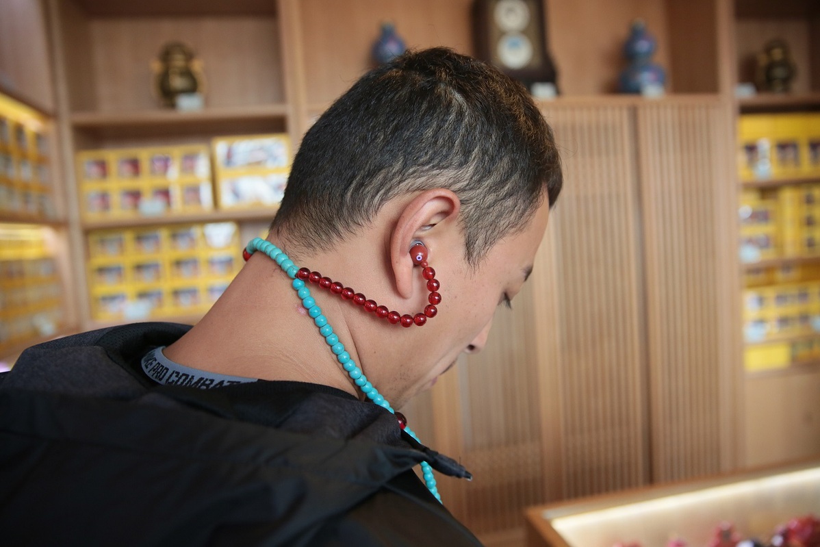 A visitor tries wired earphones at the souvenir shop in the Palace Museum. [Photo/VCG]