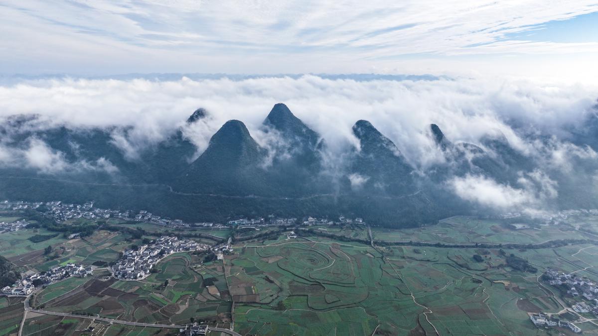 Aerial photos reveal the rolling, dough-like ridges around Xingyi in Guizhou province, all shrouded in mist. [Photo by Liu Chaofu/For chinadaily.com.cn]