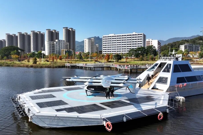 Designed for flexible deployment, the eVTOL zero-carbon water vertiport integrates a dedicated takeoff and landing area, a solar-storage-charging energy system, an intelligent dispatch center, and omnidirectional communications support.