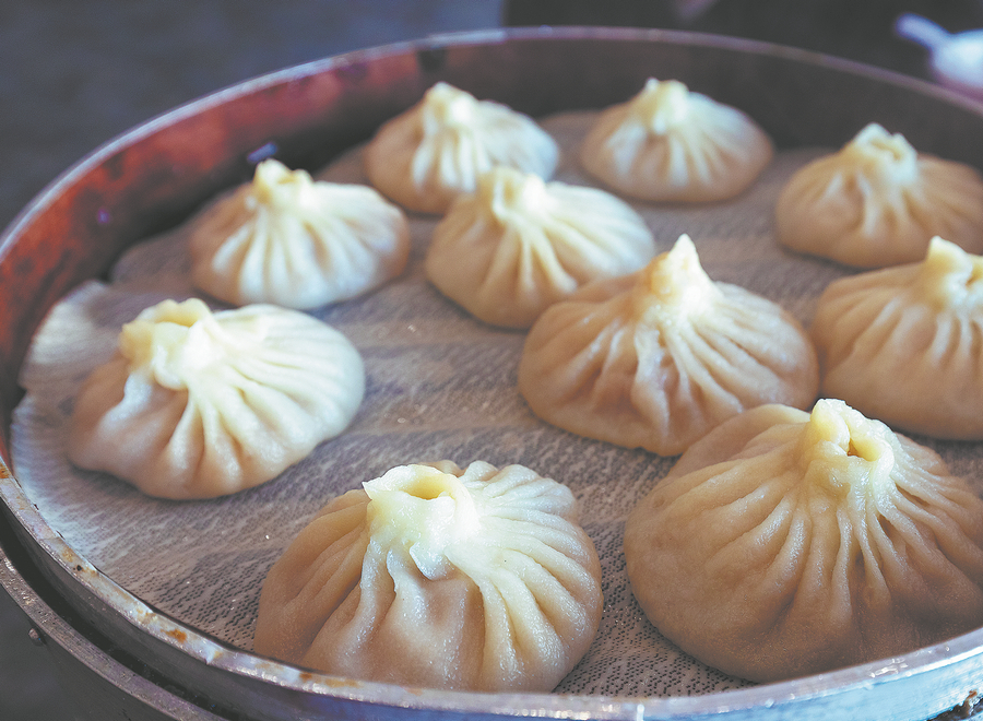 The technique for eating them is crucial: gently lift a dumpling with chopsticks, place it on a spoon, and nibble a small hole in the side to sip the hot soup first — this avoids burns to the mouth from a sudden burst of hot soup. Dip the remaining dumpling in vinegar or a touch of shredded ginger to balance its richness.
