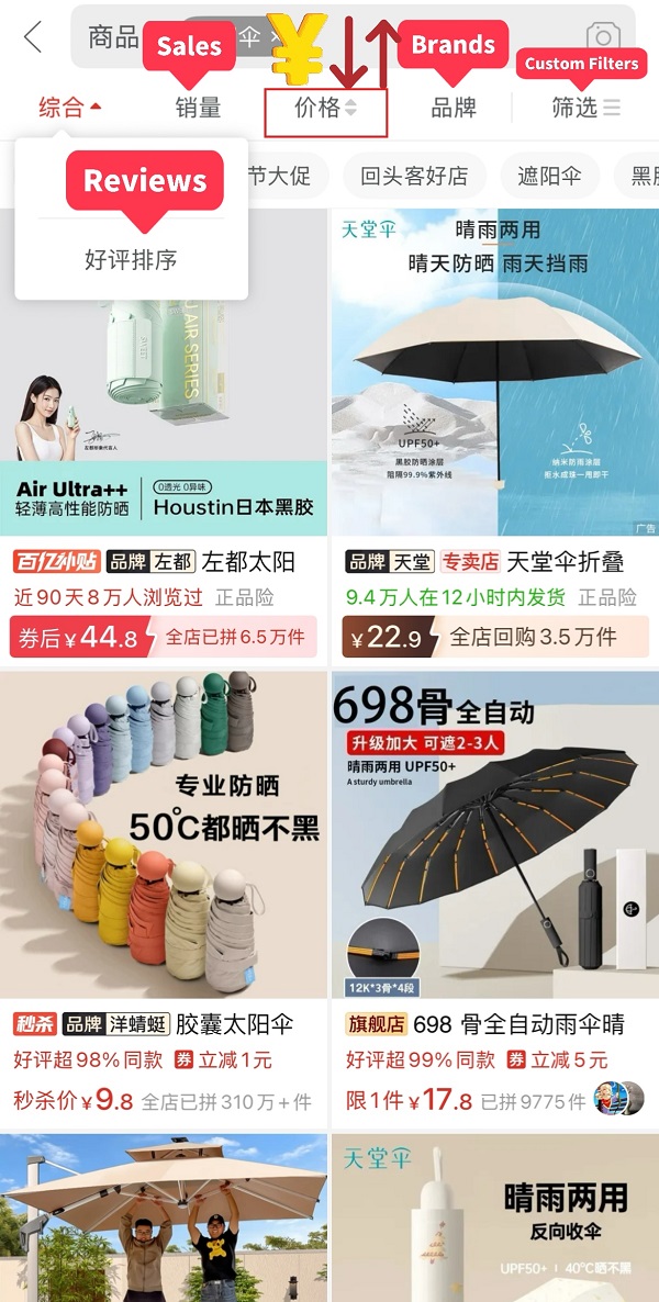 Browse the results and filter by reviews, sales, price, brand, or other options. Tap a product to see details, variations (color, size, model), and reviews. If needed, take a screenshot and use a translation app to understand the description.
