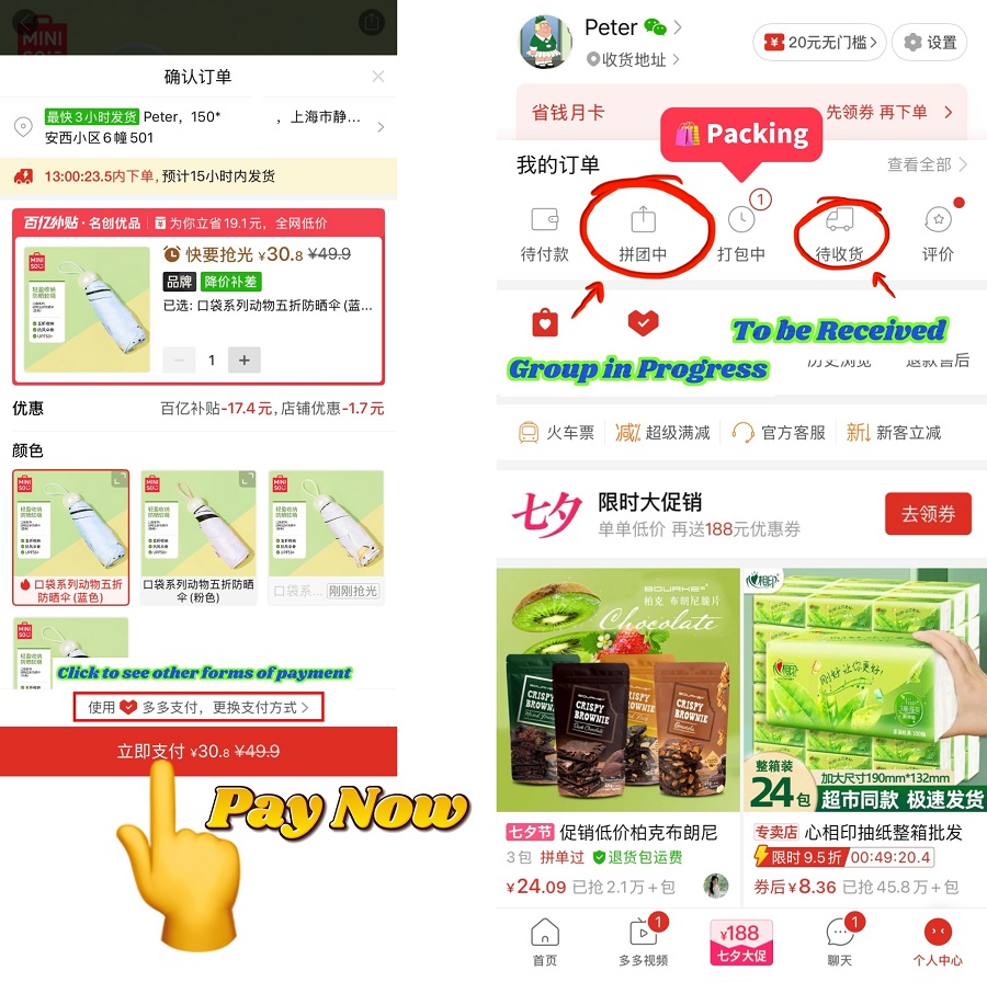 After choosing the quantity and buying option, proceed to payment. Pinduoduo supports: