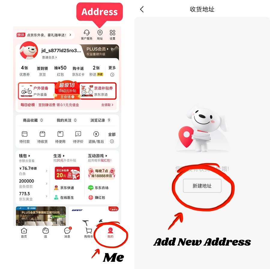 On the bottom navigation bar, tap "Me" (Chinese: 我的). Then, tap the address icon in the top-right corner and choose "Add New Address".