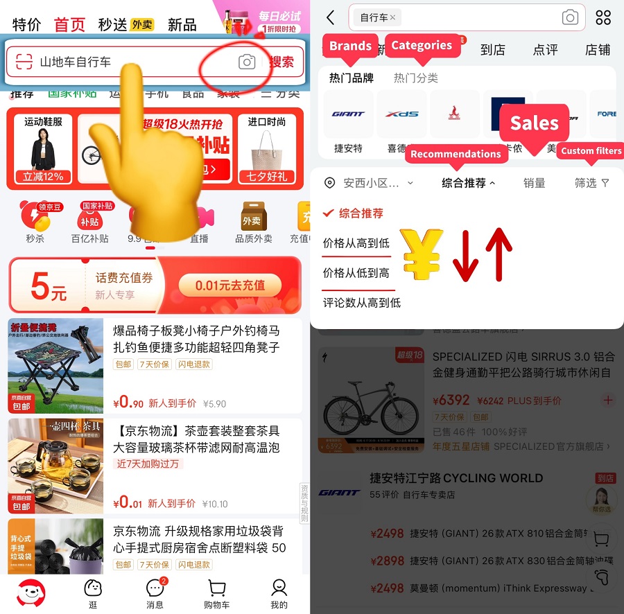 Enter keywords in Chinese in the search bar. For example, type "自行车" for "bicycle". You can also tap the camera icon to take a picture or upload one to find similar items. Search results can be filtered by brand, category, such as mountain, city, folding, or electric bikes, as well as price, sales, or custom filters.