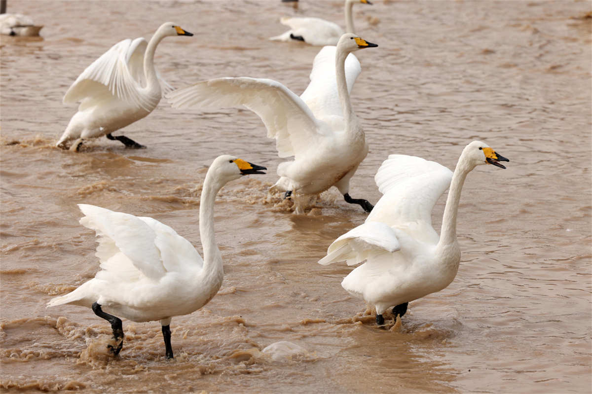 Located at the border between Shanxi and Henan provinces, the Yellow River wetland in Shanxi's Pinglu county features a mild climate and abundant food resources, making it one of China's key wintering grounds for white swans.